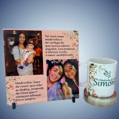 Presente especial composto por um azulejo decorativo e um xícara personalizada, com frases e imagens cheia de significado.
