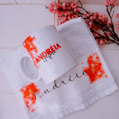 Kit caneca mais toalhinha de mão branca. Personalizada com o nome. Ideal para o dia a dia, empresa, lembranças para eventos.